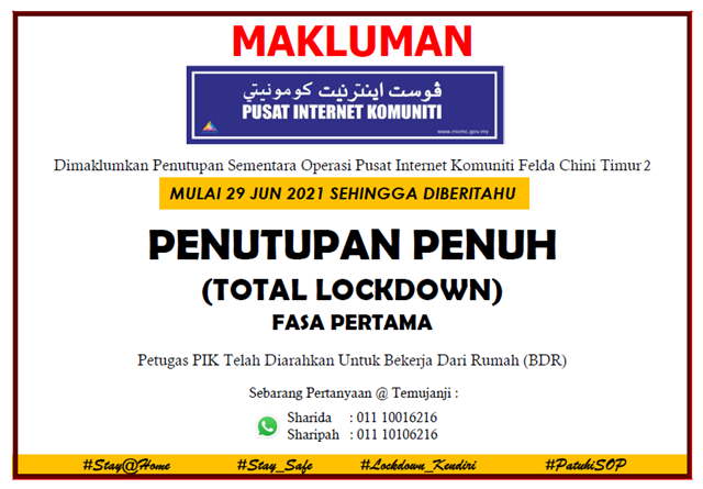 Perintah Kawalan Pergerakan (PKP) ‘total lockdown’ di seluruh negara dilanjutkan sehingga 28 Jun 2021.Sehubungan dengan itu, semua operasi Pusat Internet Komuniti diseluruh Malaysia masih ditutup. Walaupun begitu, petugas PIK masih bertugas secara ‘BDR’.